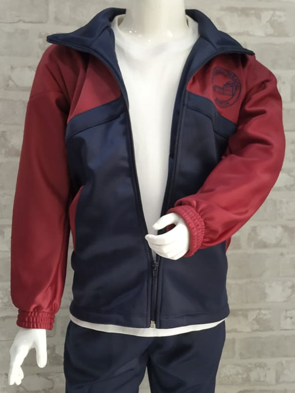 Sudadera de chandal para deporte con el escudo del colegio y el nombre en la espalda.